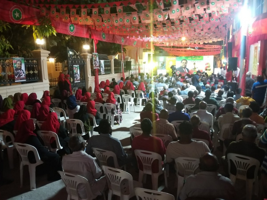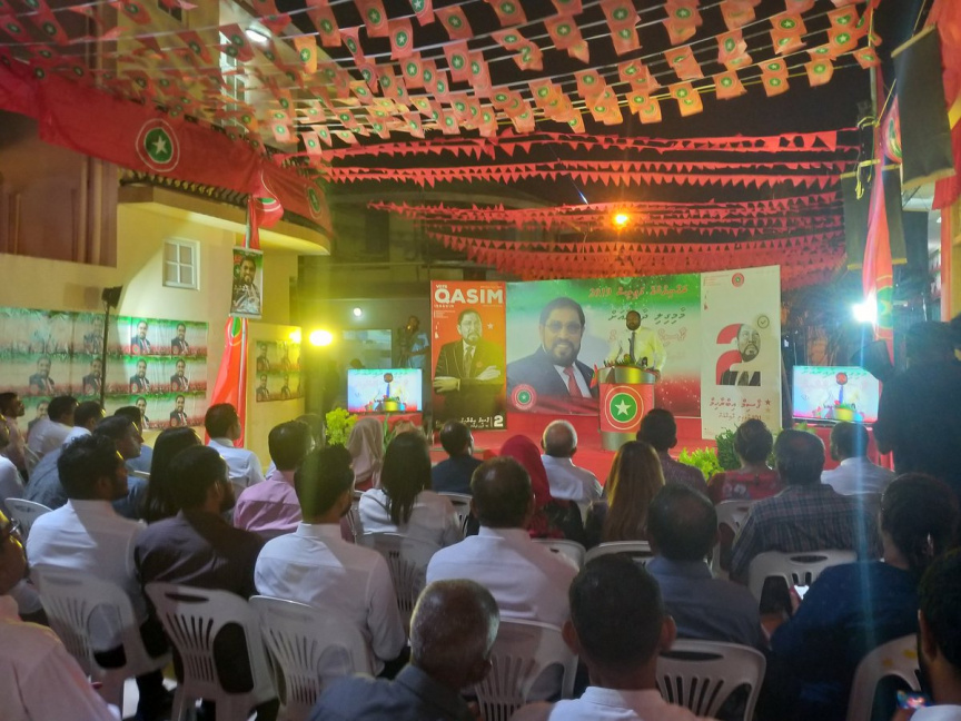 ގާސިމް ކެމްޕެއިން ލޯންޗްކުުރުމަށް ޖުމްހޫރީ ޕާޓީން ރޭ މާމިގިލީގައި ބޭއްވި ޖަލްސާގެ ތެރެއިން: އަލީ ވަހީދު ވަނީ ގާސިމް އާއި ކާނަލް ނާޒިމް، ރިޔާޒު އަދި ޖަމީލަށް ތައުރީފްކޮށް ވާހަކަ ދައްކަވާފައި -- ޓްވީޓާ ފޮޓޯ/ ޖުމްހޫރީ ޕާޓީ