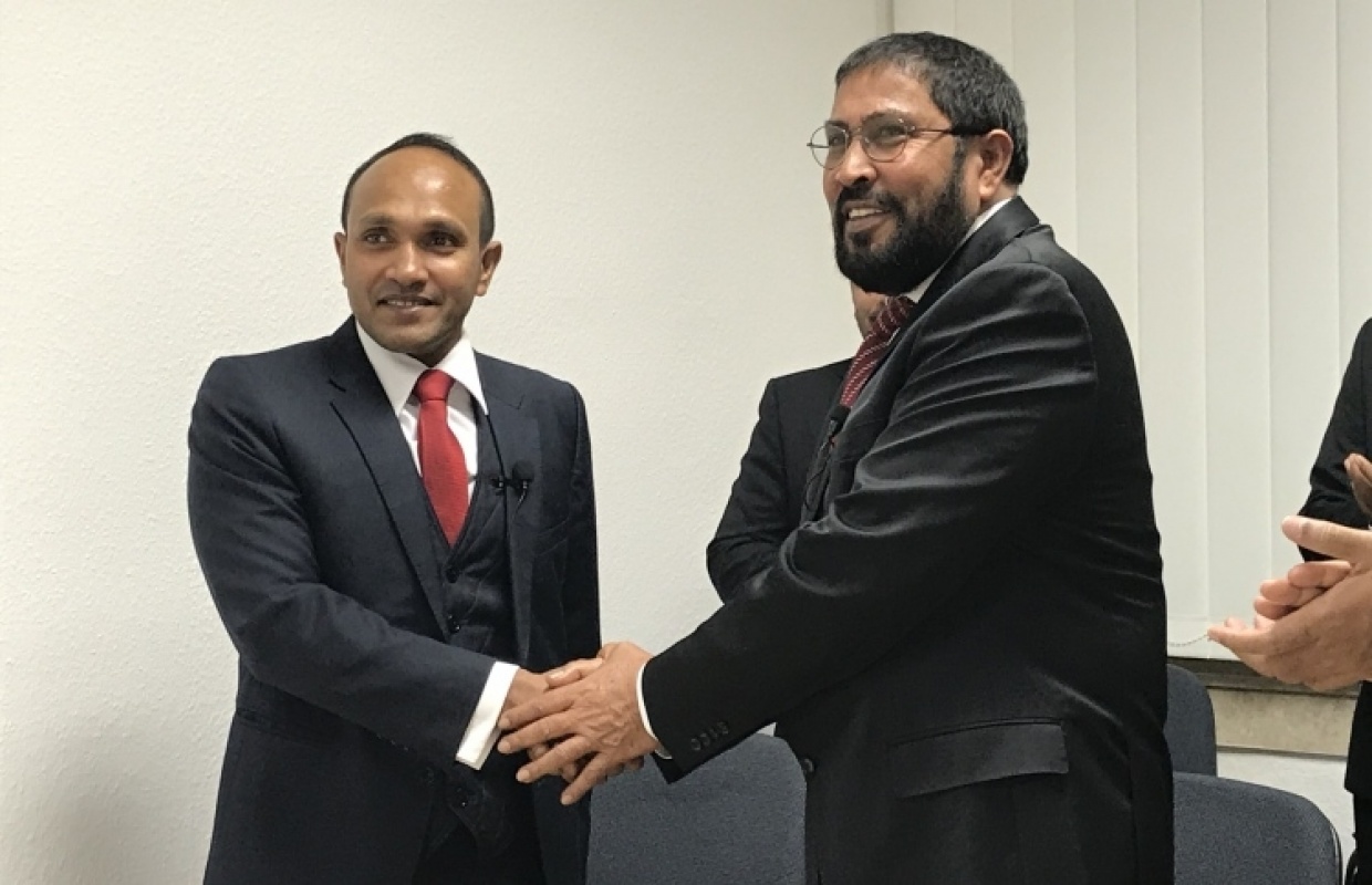 ކުރީގެ ޔޫތު މިނިސްޓަރު މަލީހް ޖޭޕީއަށް ސޮއިކުރެއްވުމަށްފަހު ގާސިމްއާ ސަލާމް ކުރައްވަނީ --- ފޮޓޯ: ޖޭޕީ