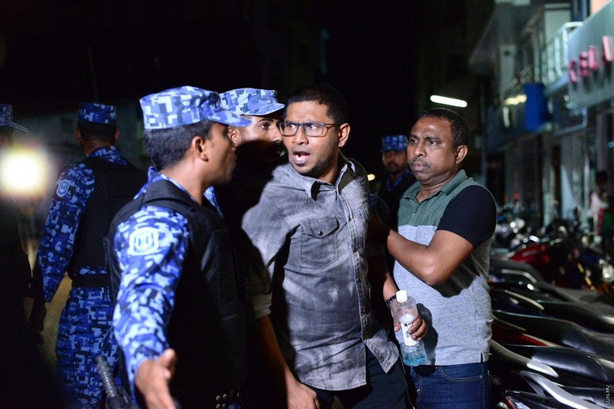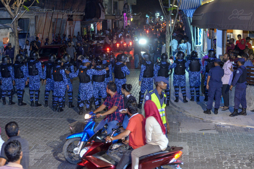 އެމްޑީޕީ ހަރުގެ ސަރަހައްދަށް އެއްވެފައި ތިބި މީހުން ދުރަށް ޖެއްސުމަށް ފުލުހުން ހަރަކާތްތެރިވަނީ: މިރޭ ފުލުހުން ވަނީ ބާރުގެ ބޭނުންކޮށްފައި --- ސަން ފޮޓޯ/ މުހައްމަދު އަފްރާހް