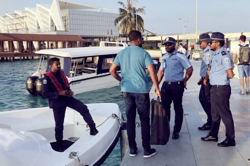 ފުލުހުންގެ އިންސްޕެކްޓަރ ޢަބްދުﷲ އިބްރާހީމް، ވެލާނާ އިންޓަނޭޝަނަލް އެއަރޕޯޓުން ފުލުހުންގެ ބެލުމުގެ ދަށަށް ގެންދަނީ-- ފޮޓޯ: ސޯޝަލް މީޑިއާ
