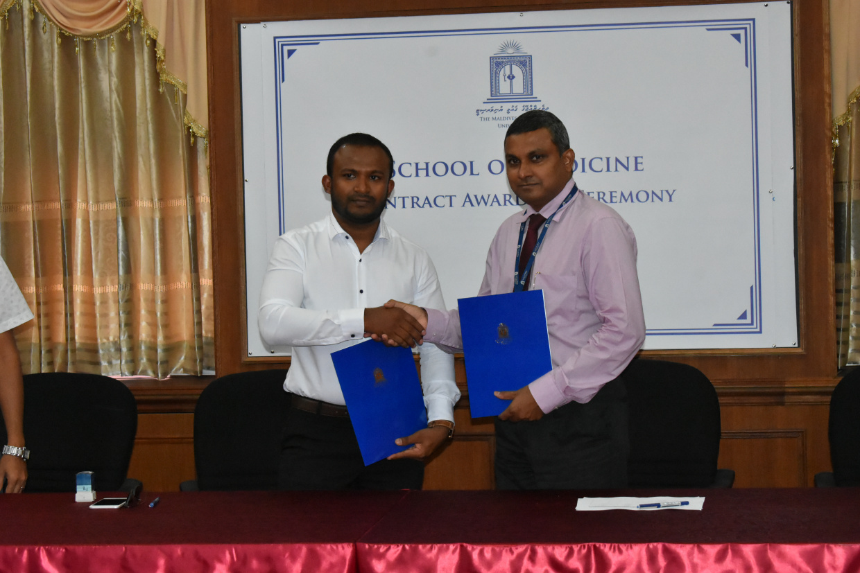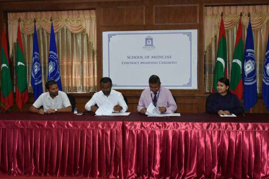 "ސްކޫލް އޮފް މެޑިސިން" ގެ ސްކިލްސް ލެބަށް ބޭނުންވާ ބައެއް ތަކެތި ގަތުމަށްޓަކާ ވޯލްޑިވްސް ޕްރައިވެޓް ލިމިޓެޑާއެކު އެއްބަސްވުމުގައި ސޮއި ކުރުމުގެ ތެރެއިން-- ފޮޓޯ: އެމްއެންޔޫ