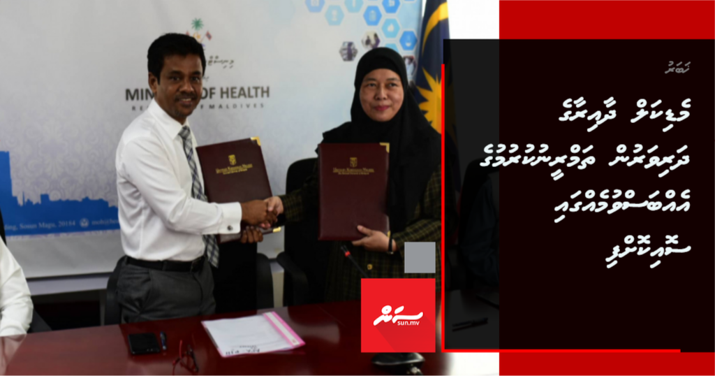 ހެލްތު މިނިސްޓްރީގައި މިއަދު ބޭއްވި ހާއްސަ ރަސްމިއްޔާތުގައި އެކަމާ ގުޅޭ އެއްބަސްވުމުގައި ހެލްތް މިނިސްޓަރު އަބްދުﷲ ނާޒިމް އިބްރާހިމް ސޮއިކުރެއްވިއިރު ކެބަންގްސާންގެ ފަރާތުން ސޮއިކުރެއްވީ ޑީން އޮފް މެޑިސިން ޕްރޮފެސަރު ޒަލޭހާއެވެ.