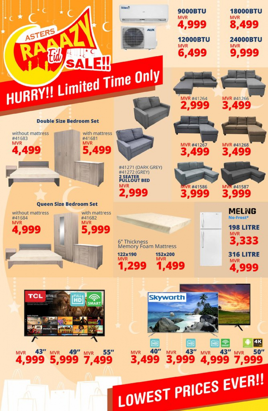 އެސްޓަސްގެ ފިހާރަތަކަށް ޒިޔާރަތްކޮށްގެން އަދި އޮންލައިކޮށް ވެސް ސޭލުން މުދާ ގަތުމުގެ ފުރުސަތު ވަނީ ހުޅުވާލައިފަ އެވެ. އެ ސޭލުން ސޯފާސެޓާއި ޓީވީ، އެއާކޮންޑިޝަނާ ބެޑްރޫމްސެޓް އަދި ފްރިޖު ވެސް ހެޔޮ އަގުގައި ލިބޭނެ ކަމަށް އެސްޓާސް އިން ބުންޏެވެ.