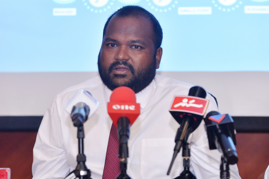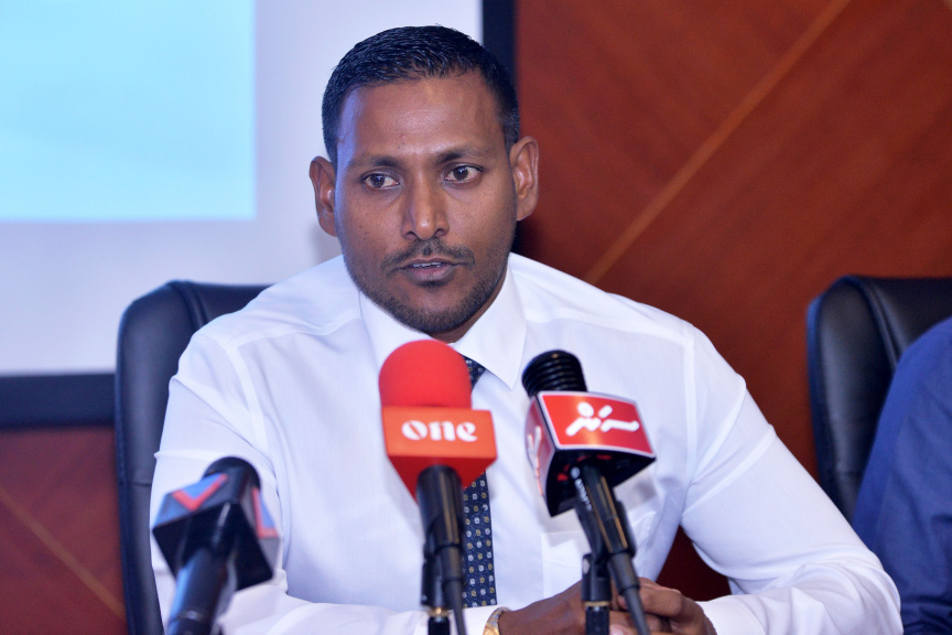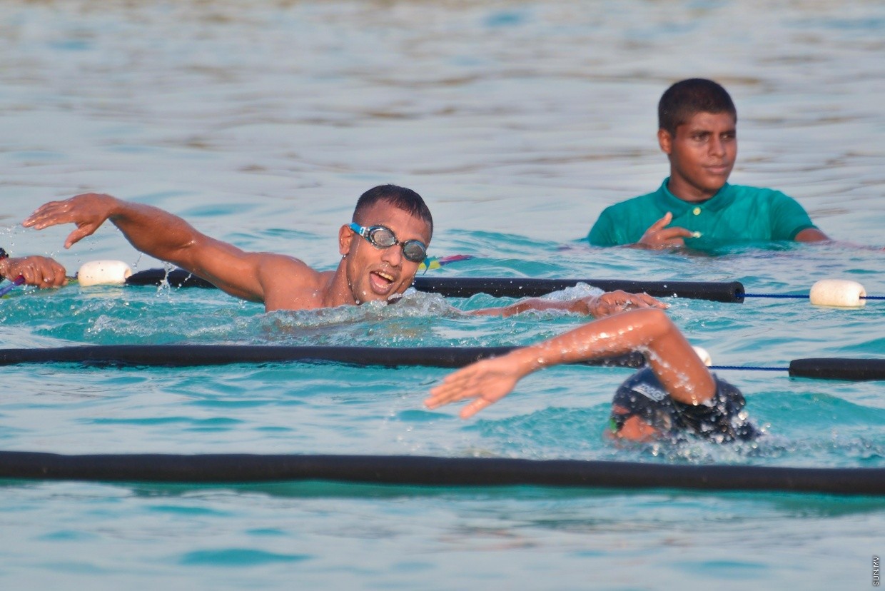 ބައޮސްފެއާ ސުވިމިންގް އިވެންޓު އިފްތިތާހު ކުރުމުގެ ތެރެއިން ސުވިމް މޯލްޑިވްސްގެ ފަރާތުން ވާހަކަ ދެއްކެވީ ހުސެން ޝަމީމް -- ސަން ފޮޓޯ / އަހުމަދު އައުޝަން އިލްޔާސް