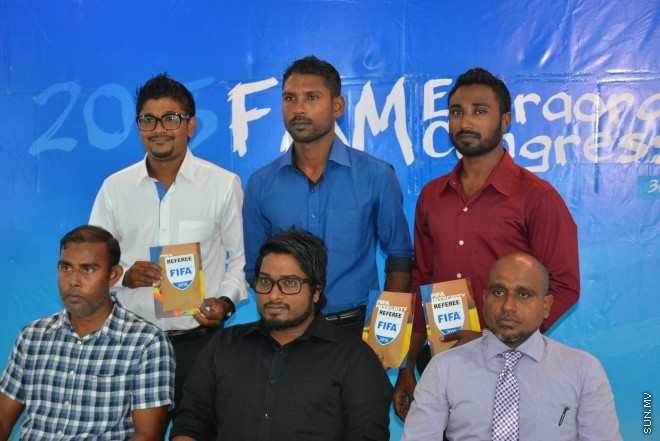 އެފްއޭއެމް ގެ ރެފްރީންގެ ތެރެއިން ފީފާގެ ރެފްރީ ބެޖް ލިބުނު ރެފްރީން އާއި އެކު ބައްސާމު އަދި އަމީޒް ފޮޓޯއަކަށް ހުއްޓިލައިގެން --- ސަންފޮޓޯ: މުއާވިއަތި އަންވަރި