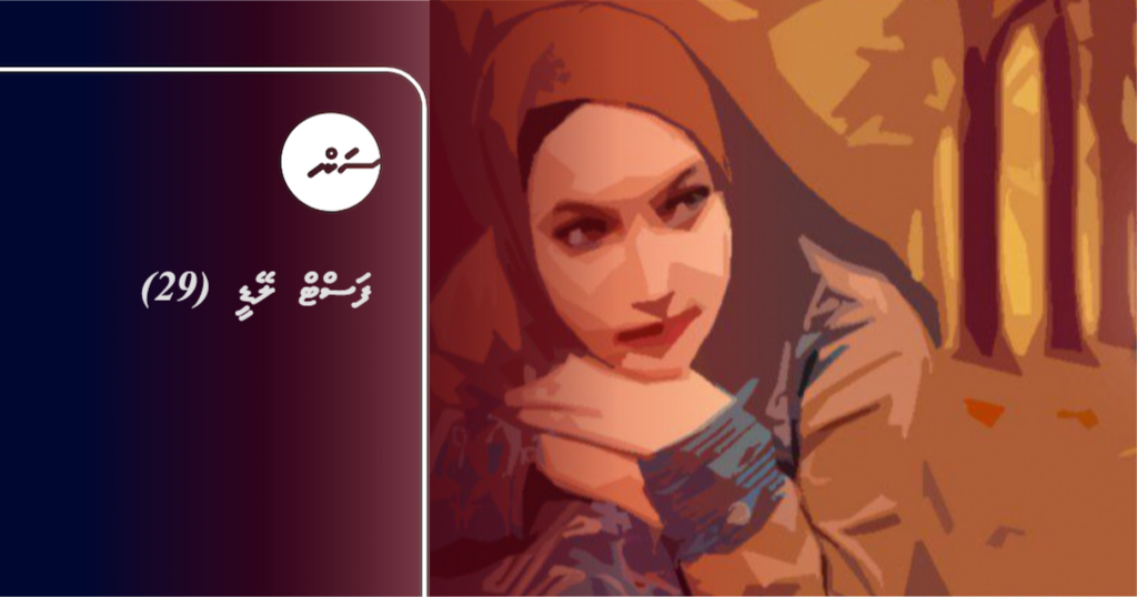 "އޯ އައި ސީ......" އަމްރާން ކޮންމެވެސް ވަރަކަށް ހިތްހަމަނުޖެހުނީކަން ނޭގެއެވެ. ނޫނީ އެކަމުން އޭނަގެ ހިތަށް އަސަރުތަކެއްކުރީ ބާވައެވެ. އަމްރާން ދެން ބުނާނެ އެއްޗެއް ނޫނީ ކޮށްލާނެކަމެއްގެ އިންތިޒާރުގައި ނޭވާ ހިފަހައްޓާލެވުނުތަނުން "އެލީން" ކިޔާ ތޫފާނެއް އަރާފާނެކަމަކަށް ހަޔާތީ ހިޔެއްނުކުރެއެވެ. ކުއްލިއަކަށް އެލީން ދޮރުމަތިން ފެނުނުކަމެވެ. ދެވަނަ ސިކުންތުކޮޅުގައި އޭނަގެ ގަޔަށް ބޮލަށް އަރައިގެންފާ އޭނަ އަޅައިގެން ހުރި ބުރުގާ ނަގާ އެއްލާލައިފިއެވެ. އަދި އެ ދިގު އިސްތަށިގަނޑު އަތަށް އޮޅައިގަތްގޮތަށް އަނެއް އަތުން ތަޅައިގަންނަން އުޅުނުއިރަށް އަމްރާން އެލީންގެ އަތުގައި ހިފިއެވެ. އެލީންއަށް އައްދިއްޔޯތް ކިޔާފައި ކަރުބުޑުން ހަޅޭއްލަވައިގަނެވުނެވެ.