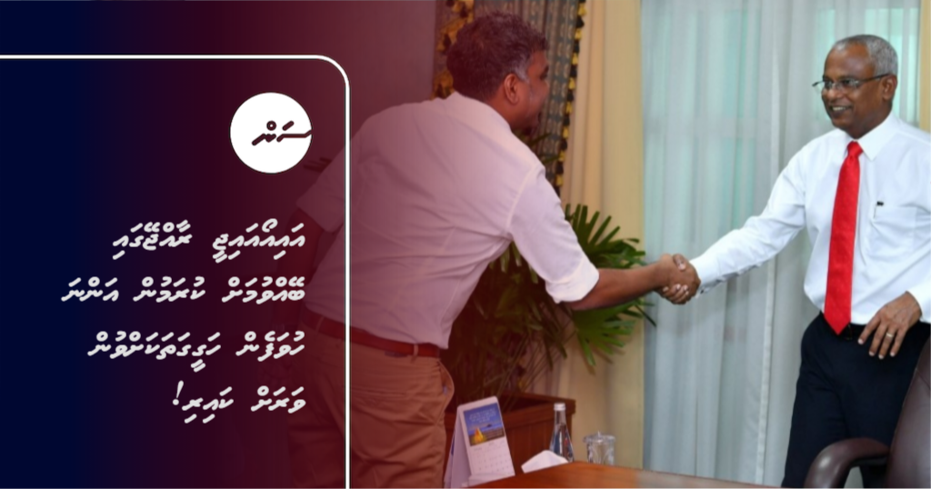 އިއްޔެ ރައީސް އޮފީހުގައި އެމްއޯސީގެ އިސްވެރިންނާއި ރައީސް ޖުމްހޫރިއްޔާ އިބްރާހިމް މުހައްމަދު ސޯލިހްގެ އިތުރުން ސަރުކާރުގެ އިސްވެރިން ވަނީ ބައްދަލު ކުރައްވައިފަ އެވެ. އެ ބައްދަލުވުމަކީ މި އަހަރުގެ ޖުލައި މަހު މޮރިޝަސްގައި ބޭއްވުމަށް ހަމަޖެހިފައިވާ އިންޑިއަން އޯޝަން އައިލެންޑް ގޭމްސް އަށް ރާއްޖޭގެ ރައީސް ވަޑައިގަތުމަށް އެ ގައުމުގެ ޓުއަރިޒަމް މިނިސްޓަރު ދެއްވި ދައުވަތު ހަވާލު ކުރުމަށް ޓަކައި ބޭއްވުނު ބައްދަލު ވުމެކެވެ.