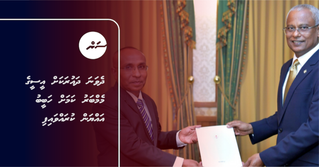 މިއަދު މެންދުރުުފަހު ރައީސް އޮފީހުގައި ބޭއްވި ރަސްމިއްޔާތުގައި އެ މަގާމަށް އައްޔަނުކުރެއްވި ލިޔުން ވަނީ ހަވާލުކޮށްފައެވެ.