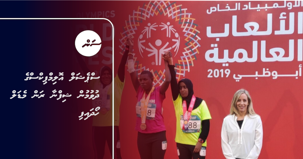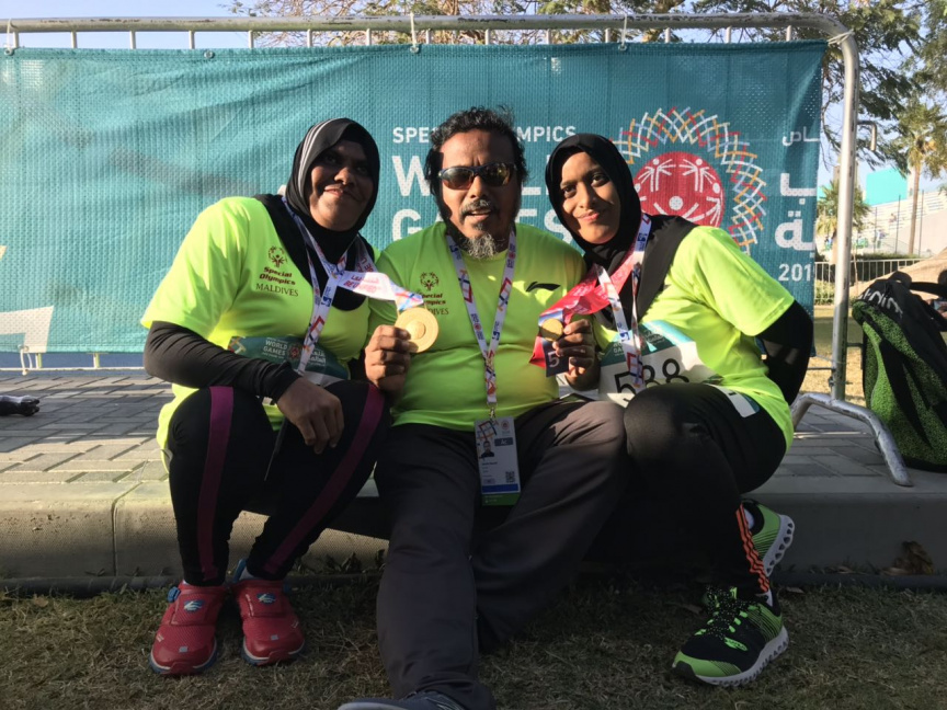 ސްޕެޝަލް އޮލިމްޕިކްސް ގެ އަންހެން ކެޓަގަރީގައި ރާއްޖެ ތަމްސީލު ކުރާ ދެ އެތުލީޓުންނާއި ރާއްޖޭގެ ސްޕެޝަލް އޮލިމްޕިކްސް ޓީމުގެ ކޯޗު --- ފޮޓޯ/ ޔޫތް މިނިސްޓަރީ