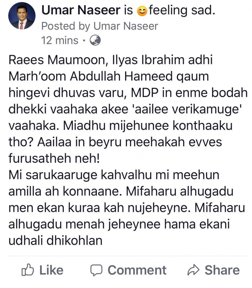 އުމަރު ކުރެއްވި ފޭސްބުކު ޕޯސްޓް --