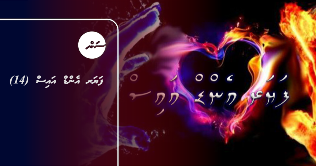 "މި އަންނަނީ....." އާޔާ އާރިޒްގެ ޒަޚަމް ސާފުކުރަންފެށިއެވެ. މަޑުކަފަކޮޅެއްގައި ތޫނުވަހެއް ދުވާ އެއްޗެއް ހާކާފައި ޖައްސައިލުމުން އަޖައިބެއްފަދަ ފިނިކަމެއް އިހުސާސްވިއެވެ. އަންގީގެ ސަބަބުން އާޔާގެ އަތުގެ އިނގިލިތައް އޭނަގެ ބޮލުގައި ނުބީހުނަސް އާރިޒްއަށް އިނގިލިތަކުގެ އިހުސާސްކުރެވި އުފާވެރިކަމެއްލިބުނެވެ. ދެމީހުންގެ ނޭވާގެ އަޑު ފިޔަވާ އެހެން އަޑެއް ނީވި ހިމޭންކަމުގެ ސިކުންތުކޮޅެއް ހިނގިއެވެ. ކުއްލިއަކަށް ސިޑިން މީހެއްގެ ފިޔަވަޅުތަކުގެ އަޑުއިވިފާ ދެން ފެނުނީ ޒުވާން އަންހެނަކު އެމީހުންގެ ކުރިމަތީގައި ހުއްޓައެވެ.