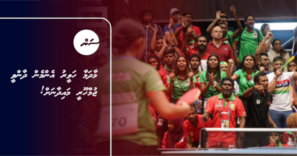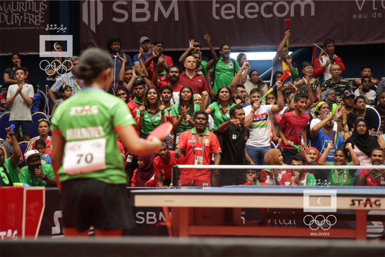 އައިއޯއައިޖީގެ ޓީޓީ އިވެންޓުގައި ރާއްޖޭގެ އައިޝަތު ރަފާ ނާޒިމާއި ދީމާ އަލީ ހޯދި ކާމިޔާބަށް ދިވެހި ޓީމުން މަރުހަބާ ކިޔަނީ --- ފޮޓޯ// އެމްއޯސީ