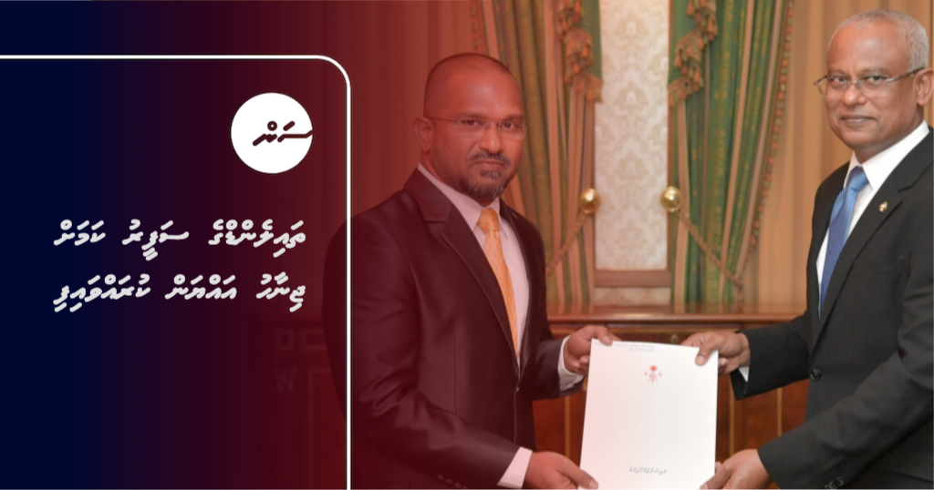 ޖިނާހަށް މަގާމުގެ ފަތްކޮޅު ރައީސް ދެއްވީ، އެކަމަށްޓަކައި މިއަދު މެންދުރުފަހު ރައީސް އޮފީހުގައި ބޭއްވި ރަސްމިއްޔާތެއްގަ އެވެ.
