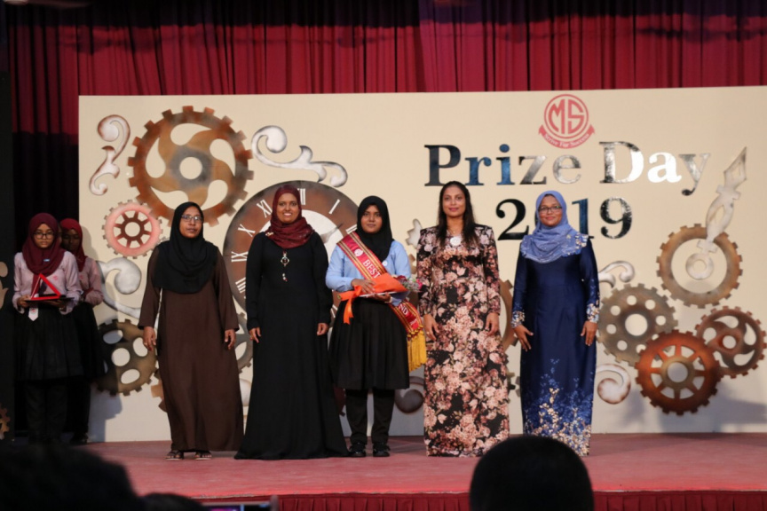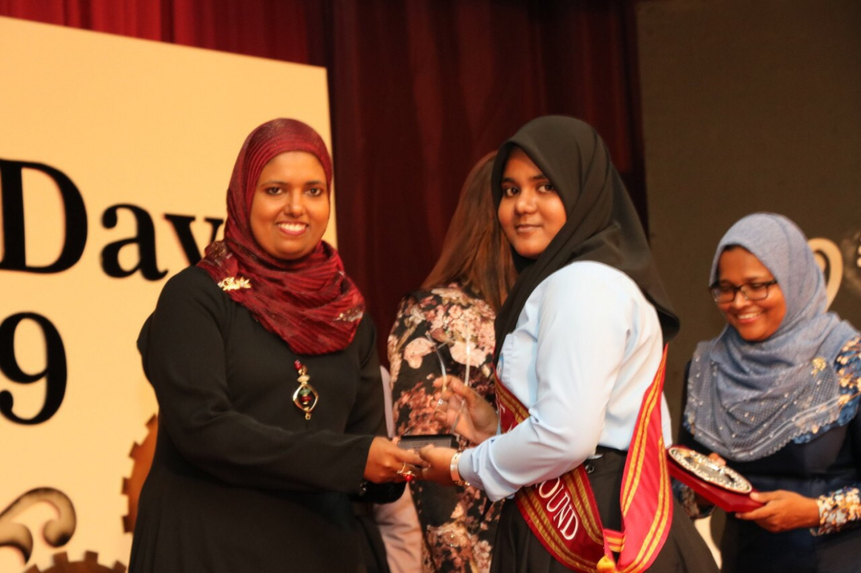 މިއަދު ހަވީރު އެ ސްކޫލުގައި ބޭއްވި އަހަރީ އިނާމް ދިނުމުގެ ޖަލްސާގައި މަލްދާއަށް އިނާމް ހަވާލުކޮށްދެއްވީ ޖެންޑާ މިނިސްޓަރު ޝިދާތާ ޝަރީފްއެވެ.