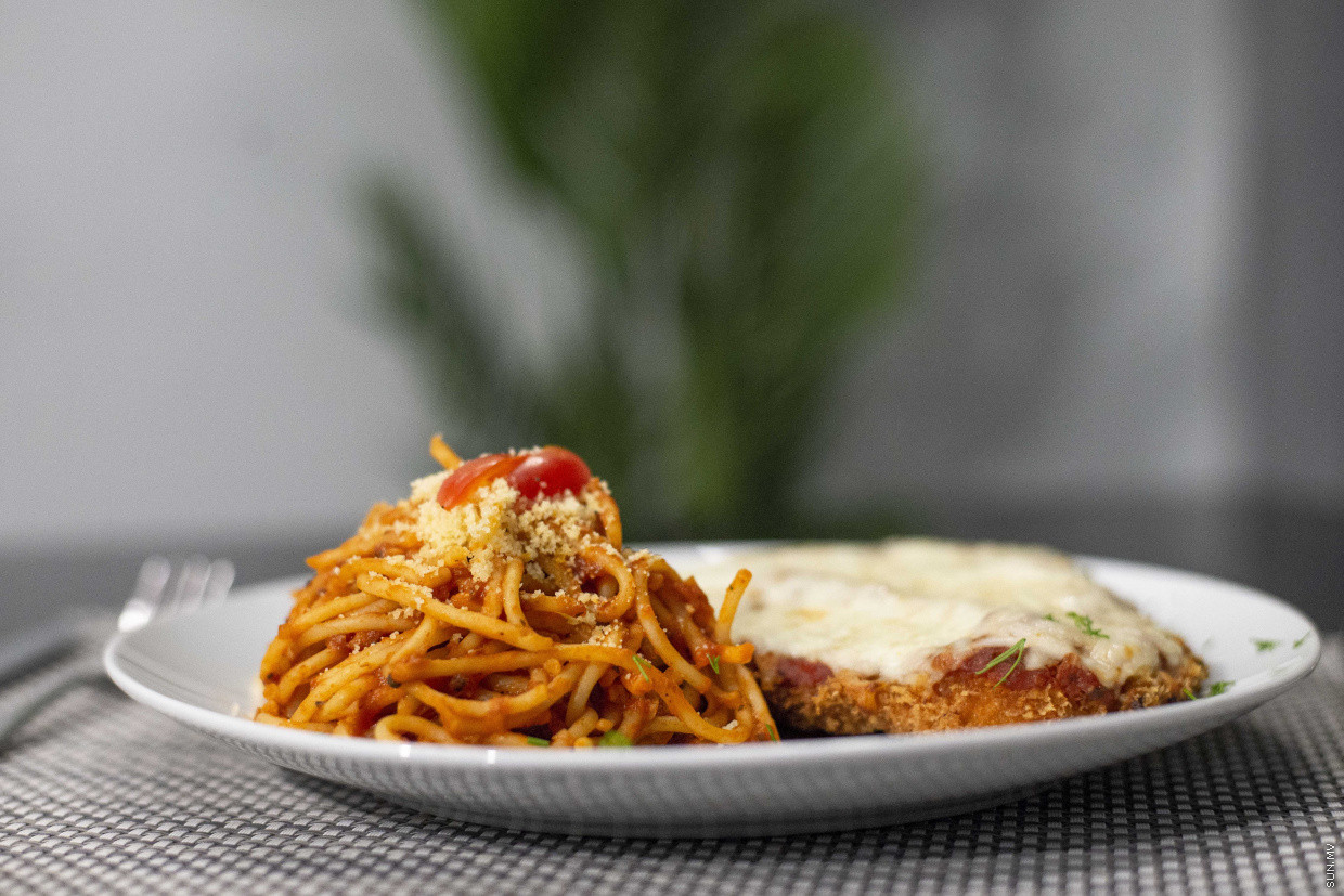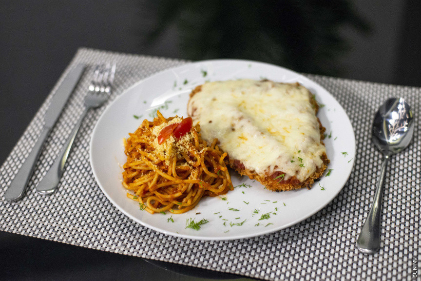 ތަށީގެ އެއް ފަޅީގައި ހުންނަނީ ކީގޯސްގެ ޝެފްގެ ޚާއްސަ މެރިނާރާ ސޯސްއާއެކު ތައްޔާރުކޮށްފައިވާ ސްޕެގެޓީއެވެ. ޖެހިގެން އޮންނަނީ ޗީޒްގެ ބޯ ފަށަލައެއް ލާފައި ހުންނަ ޗިކަން ބްރެސްޓް ފޮއްޗެކެވެ. އޭގެ ރަހަ އެންމެ ގާތްކުރަނީ މީރު މީރު ޗިކަން ޕިއްޒާއަކާއެވެ.