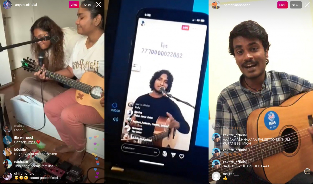 އިންސްޓަގްރާމް ލައިވް ބޭނުންކޮށްގެން ޝޯ ދިން ބައެއް ދިވެހި ފަންނާނުންގެ ތެރޭގައި އާންޔާ ހަލީމް އާއި ޝައްމޫން މުހައްމަދު އަދި ޒަކިއްޓެވެސް ހިމެނެއެވެ.