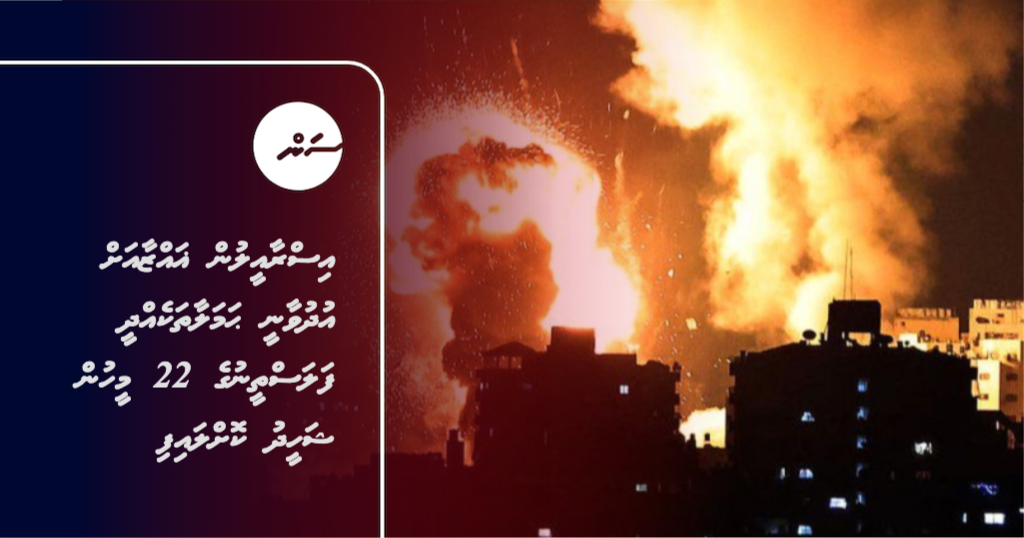 ޣައްޒާ (މޭ 11) : އިސްރާއީލުން މާތްވެގެންވާ މަސްޖިދުލްއަގްސާއަށާއި އެތަނުގައި އަޅުކަން ކުރަންތިބި މީހުންނަށް ދެމުން ގެންދިޔަ އުދުވާނީ ޙަމަލާތައް ވަގުތީގޮތުން ހުއްޓާލުމަށްފަހު ފަލަސްތީނުގެ ޣައްޒާއަށް ވައިގެ މަގުން ޙަމަލާތަކެއް ދީ 22 މީހުން ޝަހީދު ކޮށްލައިފި އެވެ.