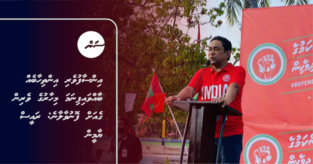 "ކުރަން ޖެހޭ ހުރިހާ ކަމެއް ސަރުކާރުން ބަރާބަރަށް ކުރޭ. ދޭން ޖެހޭ ހުރިހާ ފައިސާއެއް ރަހުމަތްތެރިންނަށް ބަހާ އެ ހަދަނީ. ހުރިހާ މުއައްސަސާއެއްގެ ބާރު އެ ވަނީ ކަނޑުވާލާފައި. ހުރިހާ މުއައްސަސާއެއް އެހުރީ ޕެރަލައިޒްކޮށްލާފައި. ވާކޮށްލާފައި. އެއްވެސް މުއައްސަސާއެއް މި ސަރުކާރު ގާނޫނާ ހިލާފަށް ކުރާ ކަމެއް ބެލޭކަށް ނެތް," ސަރުކާރަށް ވަރަށް ބޮޑަށް ފާޑުކިޔުއްވާ ރައީސް ޔާމީން ވިދާޅުވިއެވެ.