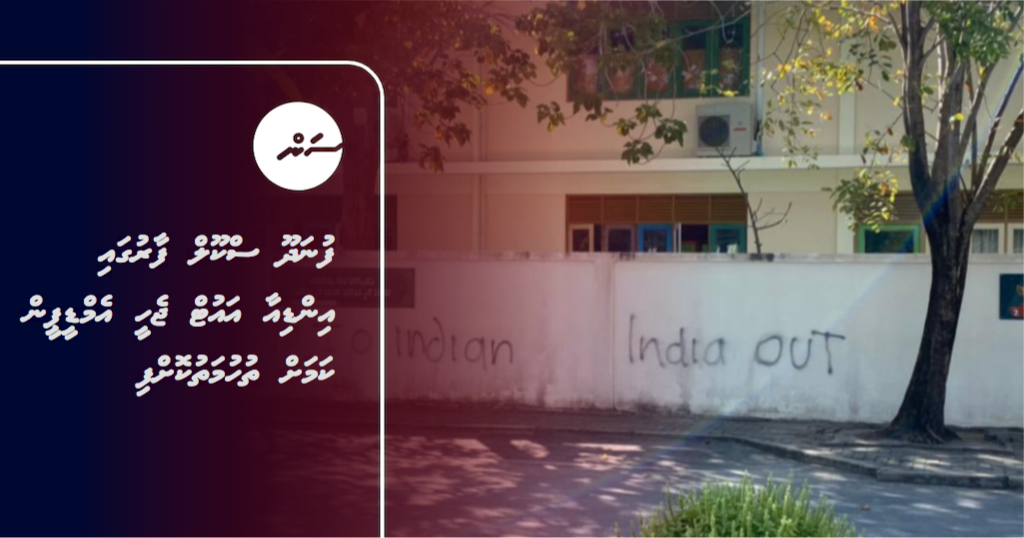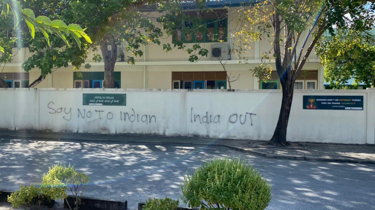 ށ. ފުނަދޫ ސުކޫލު ފާރުގައި "އިންޑިއާ އައުޓް" ލިޔެފައި ހުރި ތަނުގައި ކުލަލާފައި -- ސަން ފޮޓޯ