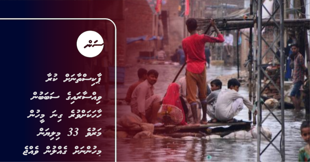 އިސްލާމްއާބާދު (28 އޮގަސްޓް 2022) : ޕާކިސްތާނަށް ކުރަމުންދާ އާދަޔާ ޚިލާފު ގަދަ ވިއްސާރައިގެ ސަބަބުން ގައުމުގެ ބޮޑުބައެއް ފެނުގެ އަޑިއަށްގޮސް ހާހަކަށް ވުރެ ގިނަ މީހުން މަރުވެ 33 މިލިޔަން މީހުންނަށް މާއްދީ ގެއްލުންތައް ލިބިފައިވާކަމަށް އެގައުމުން ބުނެފިއެވެ.