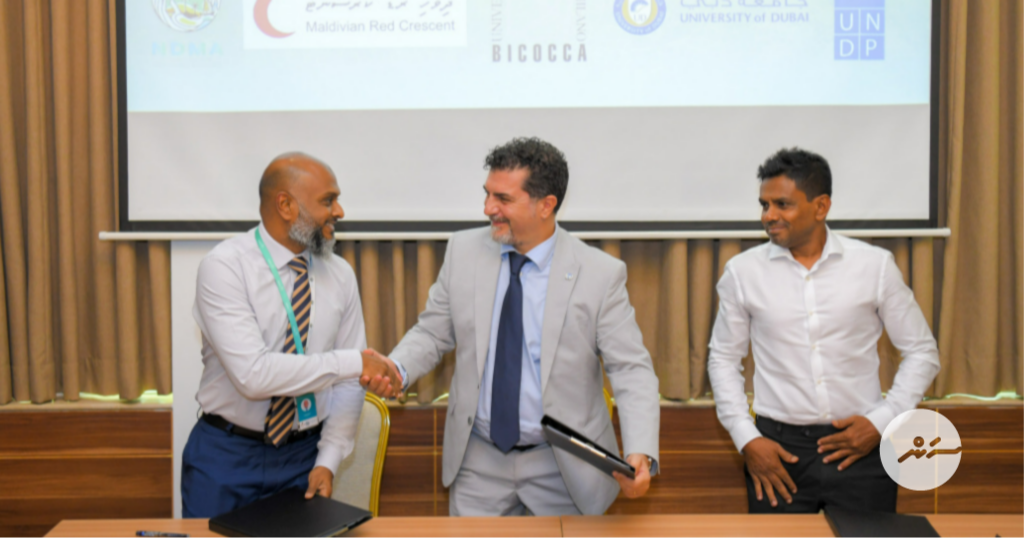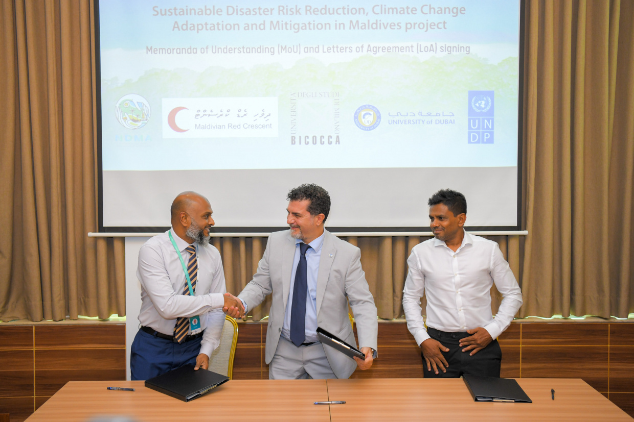 އިއްޔެ ހުޅުމާލޭގެ ސަމަން ހޯސްޓް ހޮޓެލުގައި ބޭއްވި ރަސްމިއްޔާތެއްގައި ޔޫއެންޑީޕީ އާއި އެންޑީއެމްއޭގެ އިތުރުން މޯލްޑިވްސް ރެޑް ކްރެސެންޓް ވެސް ހިމެނޭ ގޮތަށް ސޮއިކޮށްފައި ވަނީ "ސަސްޓެއިނެބުލް ޑިޒާސްޓާ ރިސްކް ރިޑަކްޝަން، ކްލައިމެޓް ޗޭންޖް އެޑެޕްޓޭޝަން އެންޑް މިޓިގޭޝަން އިން މޯލްޑިވްސް" އެމްއޯޔޫގައެވެ.