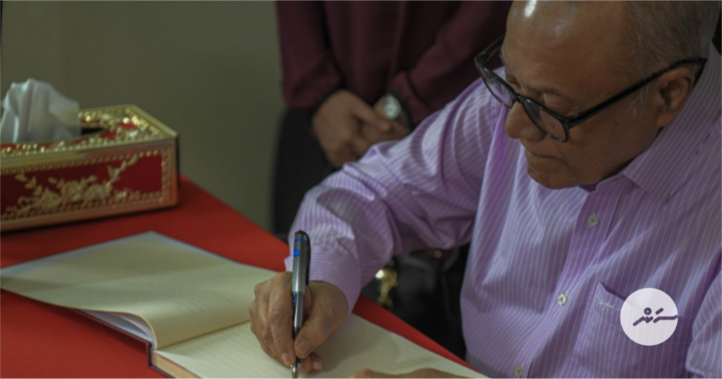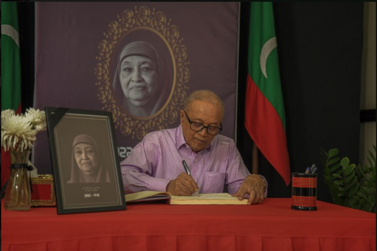 ރައީސް މައުމޫން، ޙަބީބާ ޙުސައިން ޙަބީބްގެ ތައުޒިޔާގެ ދަފުތަރުގައި ލިޔުއްވަނީ --- ސަން ފޮޓޯ/ މުހައްމަދު ޝާތިއު އަބްދުﷲ