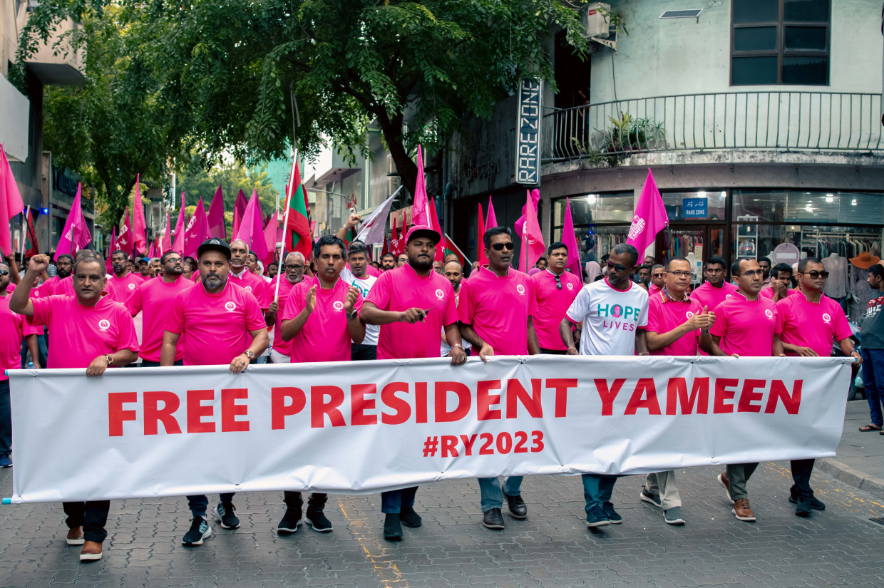 ހިނގާލުމުގެ ބައިވެރިން ވަނީ ރައީސް ޔާމީން ދޫކޮށްލުމަށް ގޮވާލާފައެވެ. ހިނގާލުން ކުރިއަށް ދިޔަ ވަގުތު ސަފުތަކުގެ ތެރެއަށް ސައިކަލެއްގައި ވަދެ ހަމަނުޖެހުންހިންގަން މަސައްކަތްކުރި މީހަކު ވަނީ ފުލުހުންގެ ބެލުމުގެ ދަށަށް ގެންގޮސްފައެވެ. އެކަމާ ގުޅޭ އިތުރު މައުލޫމާތު ފުލުހުން ހާމަކޮށްފައެއް ނުވެއެވެ.