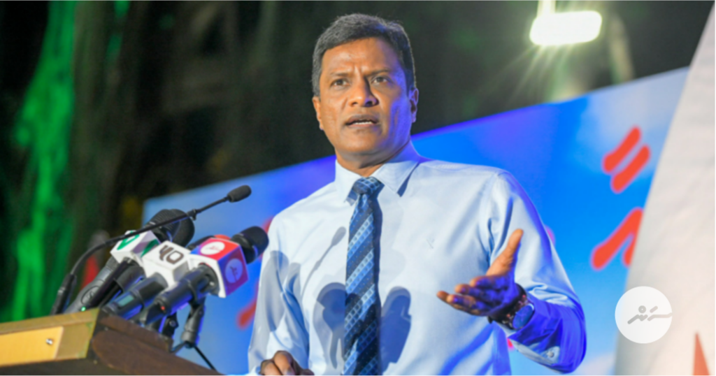 ކެމްޕޭން އިފްތިތާހު ކުރުމަށް ރޭ ބޭއްވި ޖަލްސާގައި އުމަރު ނަސީރު--- ސަން ފޮޓޯ/ މުހައްމަދު ޝާތިއު އަބްދުﷲ