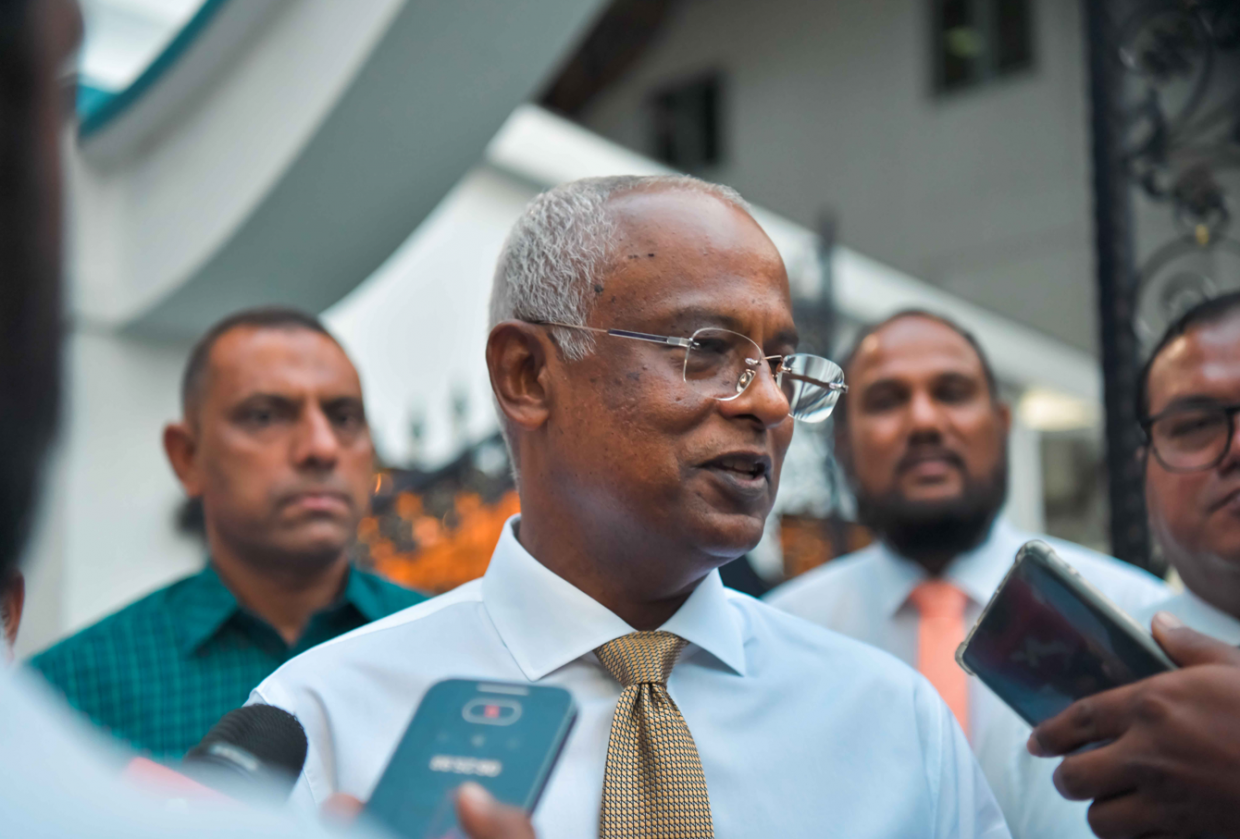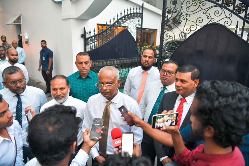 ކޯލިޝަން މަޝްވަރާއަަށް މުލީއާގޭގައި އޮތް ބައްދަލުކުރެއްވުމަށްފަހު ނޫސްވެރިންނާ ރައީސް ވާހަކަދައްކަވަނީ -- ސަން ފޮޓޯ / މުހައްމަދު ޝާތިއު އަބްދުﷲ