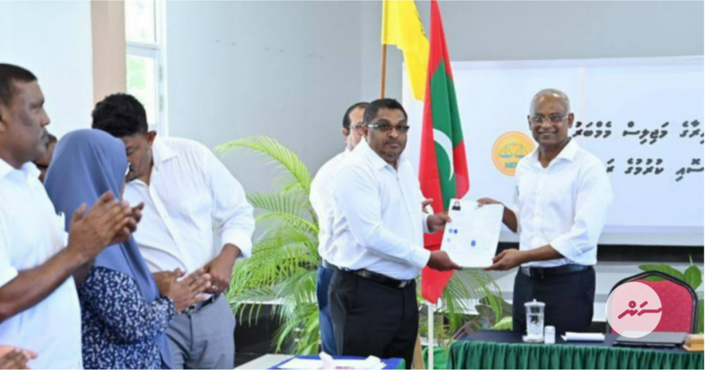ވެރިކަން ކުރާ މައި ޕާޓީ އެމްޑީޕީއާ ޖޭފޯ ގުޅިވަޑައިގެން ރައީސް އިބްރާހިމް މުޙައްމަދު ޞާލިޙާ ފޯމު ހަވާލުކުރެއްވީ މިއަދު ރައީސް ފ. އަތޮޅަށް ފެއްޓެވި ދަތުރުފުޅުގައި ނިލަންދޫގައެވެ.