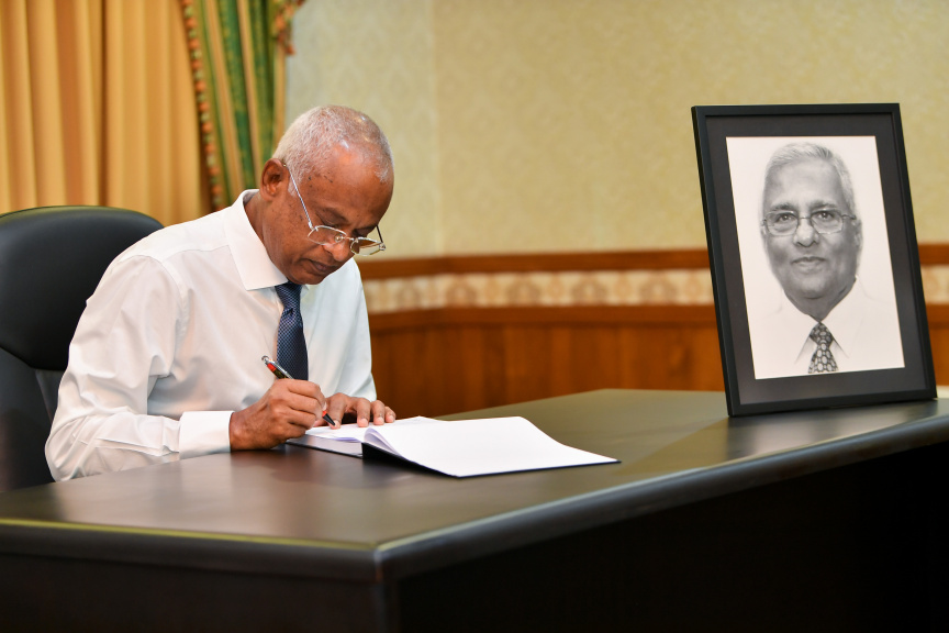 އަލްމަރްޙޫމް ޢަބްދުﷲ ޖަމީލްގެ ހަނދާނުގައި ރައީސުލްޖުމްހޫރިއްޔާގެ އޮފީހުގައި ހުޅުވި ތައުޒިޔާގެ ދަފުތަރުގައި ރައީސް ސޮއިކުރެއްވުން -- ފޮޓޯ/ ރައީސް އޮފީސް