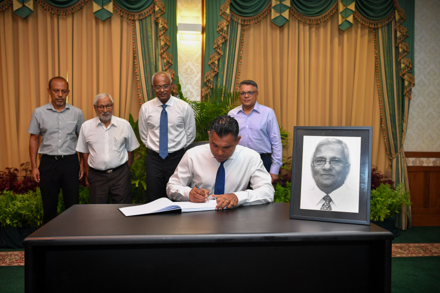 އަބްދުﷲ ޖަމީލްގެ ހަނދާނުގައި ރައީސުލްޖުމްހޫރިއްޔާގެ އޮފީހުގައި ހުޅުވި ތައުޒިޔާގެ ދަފުތަރުގައި ނައިބުރައީސް ފައިސަލް ނަސީމް ސޮއިކުރައްވަނީ -- ފޮޓޯ/ ރައީސް އޮފީސް