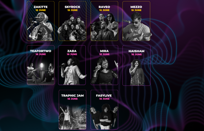 މި ފެސްޓުގެ ފުރަތަމަ ދުވަހު ޒަކިއްޓޭ، މެޒޯއާއެކު ވައިޓް ޓާން، ސްކައިރޮކް ބޭންޑް އަދި ރަވެއޯ ފަދަ ހުނަރުވެރި ފަރާތްތައް ހުށަހަޅާއިރު، ދެވަނަ ދުވަހު ޓީފޯޓޫ، މީރާ، ޒާރާ އަދި ހައިޝާމްގެ އިތުރުން ޓްރެފިކް ޖޭމް އަދި ފަސީ ލައިވް ވެސް ހުށަހަޅާނެއެވެ.