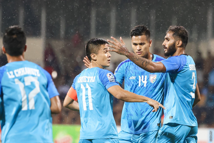ސާފް ޗެމްޕިއަންޝިޕް 2023 ގައި ޕާސްކިތާން ކޮޅަށް ގޯލު ޖެހުމަށްފަހު އިންޑިއާގެ ކުޅުންތެރިންނާއެކު ކެޕްޓަން ސުނިލް ޗެތުރީ އުފާފާޅުކުރަނީ -- ސަން ފޮޓޯ/ އަބްދުﷲ އަބީދު