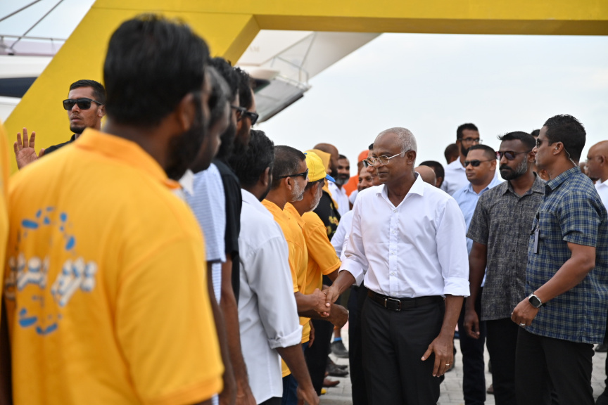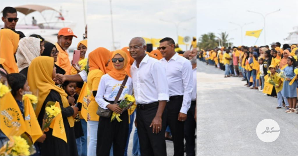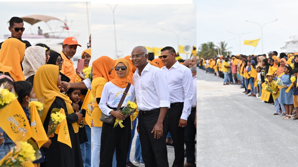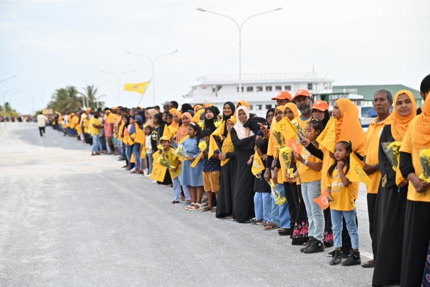 ކުޅުދުއްފުށިން ރައީސަށް މަރުަހަބާ ކިޔުމަށް ޓަކައި ހާހަކަށްވުރެ ގިނަ ރައްޔިތުންވަނީ ނިކުމެފައި -- ފޮޓޯ/ އެމްޑީޕީ