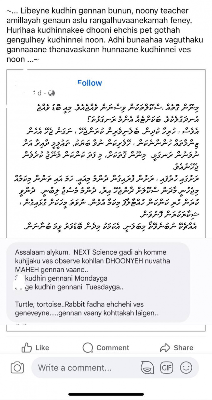 "ލިބޭ ކުދިން ގެންނަން ބުނުން، ނޫނީ ޓީޗަރު އަމިއްލައަށް ގެނައުން އަސްލު ރަނގަޅު ގޮތް ކަމަށް ފެނޭ. ހުރިހާ ކުދިންނަކީ ދޫނި އެއްޗެހި "ޕެޓް" ގޮތަށް ގެންގުޅޭ ކުދިންނެއް ނޫން. އަދި ބުނާހާ ވަގުތަކު ގަންނާނެ ތަނަވަސްކަން ހުންނާނެ ކުދިންނެއް ވެސް ނޫން،" މިކަމާ ގުޅިގެން ފޭސްބުކްގައި ހިޔާލު ފާޅުކުރި މީހަކު ބުނެފައި ވެއެވެ.