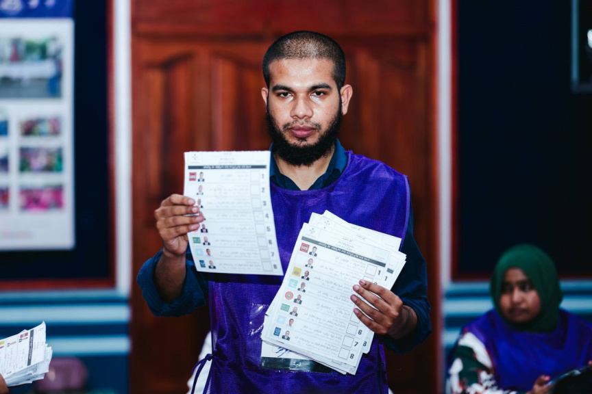 ރިޔާސީ އިންތިޚާބު 2023ގެ ވޯޓުލުމުގެ ފުރަތަމަ ބުރުގައި ވޯޓު ކަރުދާސް ގުނަނީ -- ސަން ފޮޓޯ
