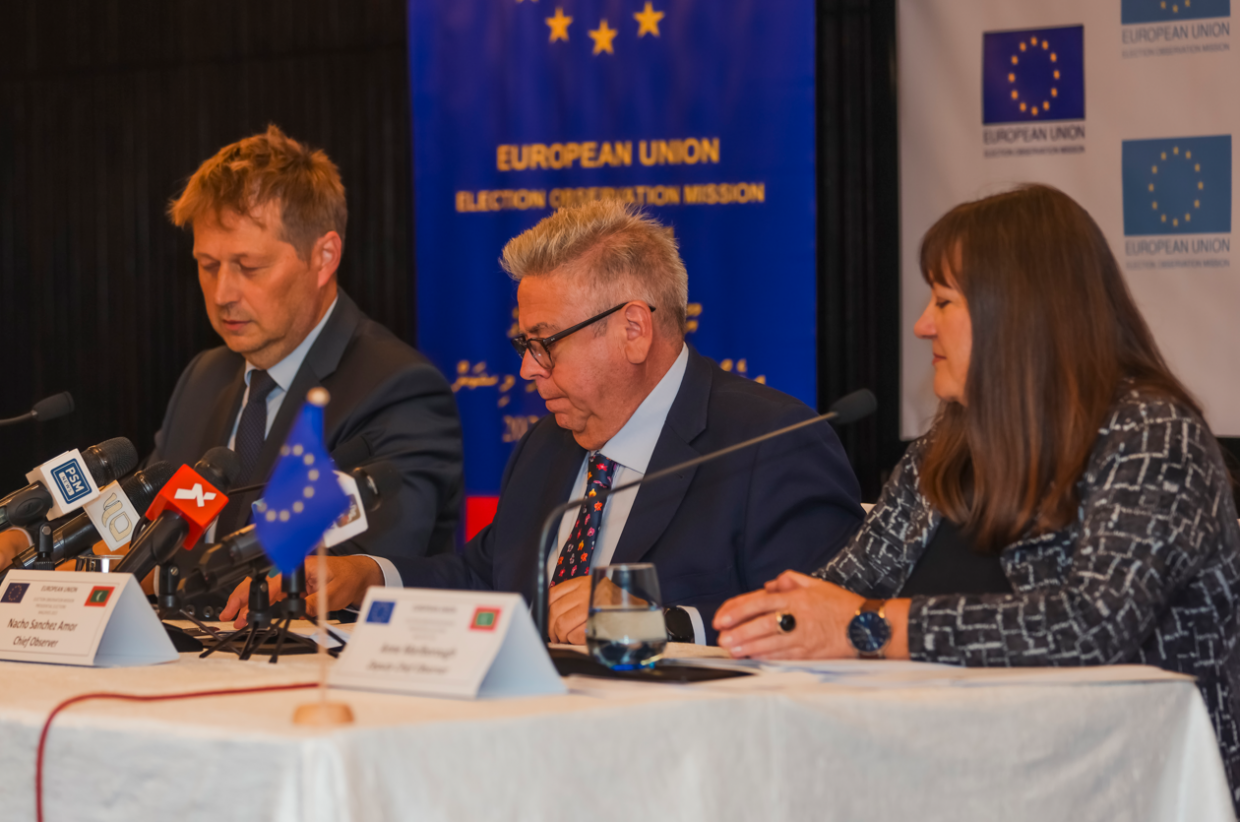 އީޔޫގެ އިލެކްޝަންސް އޮބްޒަވޭޝަން ޓީމުން މިއަދު ބޭއްވި ޕްރެސް ކޮންފަރެންސް-- ސަން ފޮޓޯ/ މުހައްމަދު މާވީ