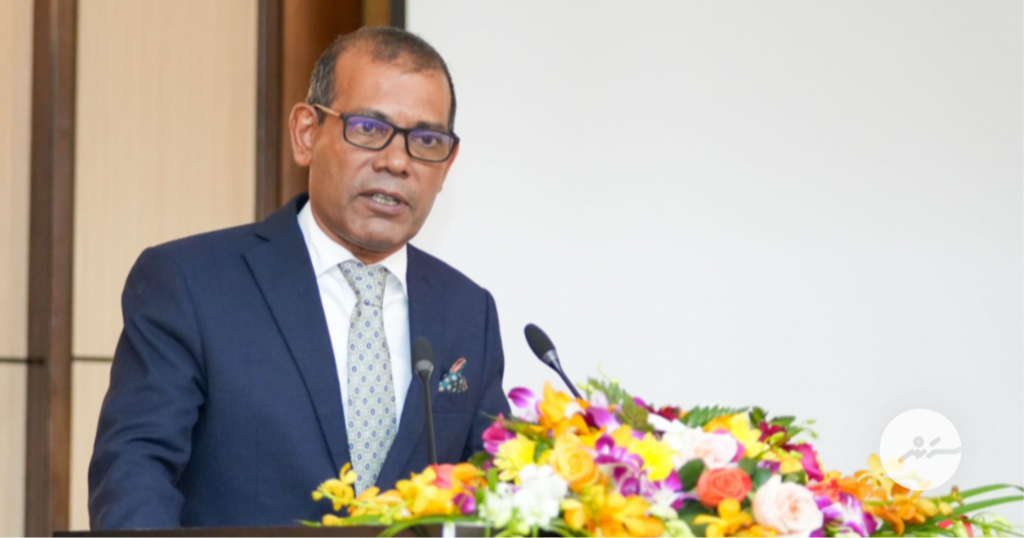 "އަޅުގަނޑުމެންގެ ތެރޭގައި ހުރީ ވެރިކަމާ ހަވާލުވާން ތައްޔާރުވަމުން އަންނަ ރައީސެއް. އެހެންކަމުން އެ ބޭފުޅާ [ޑރ. މުހައްމަދު މުއިއްޒު]އަށް މި ހަފްލާ ޝަރަފުވެރިކޮށް ނުދެވޭނެ. ދެން ހުރީ މަގާމުގެ ވާޖިބުތައް ދޫކުރައްވައި ވަޑައިގަންނަވާ ރައީސެއް [ރައީސް އިބްރާހިމް މުޙައްމަދު ޞާލިހު]. އެހެންކަމުން އެ ބޭފުޅާއަށް ވެސް މި ހަފްލާ ޝަރަފުވެރިކޮށް ނުދެވޭނެ. ހަމައެކަނި ހުރި މީހަކީ އަޅުގަނޑު،" ރައީސް ނަޝީދު ވިދާޅުވިއެވެ.