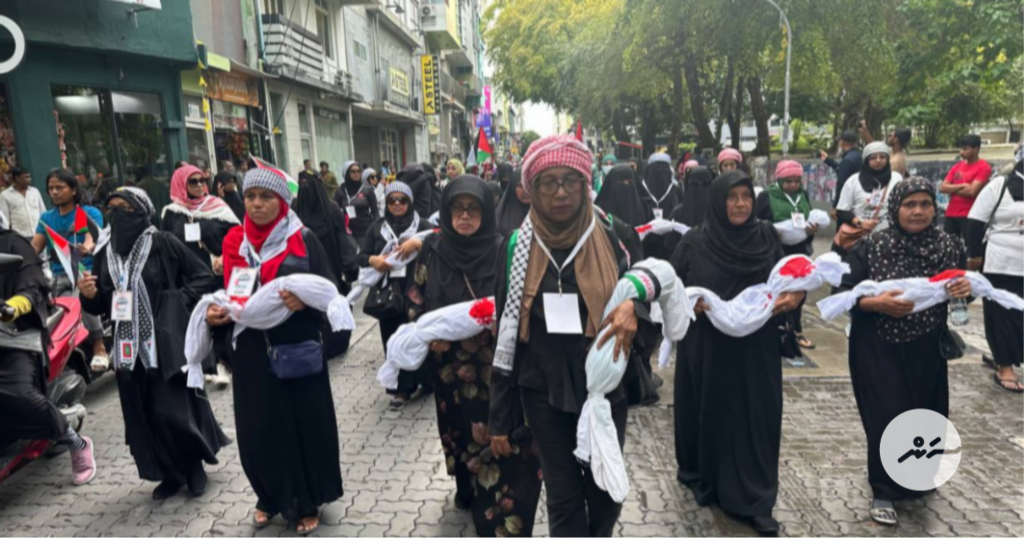 "އެހެންވީމަ އަޅުގަނޑުމެން މިއަދު ނުކުމެ މިތިބީ ފަލަސްތީނު ރައްޔިތުންގެ ހައްގުގައި އެ މީހުންނާ އެކު އަޅުގަނޑުމެން ވެސް އެބަ ތިބިކަން ދައްކާލުމަށްޓަކައި،"