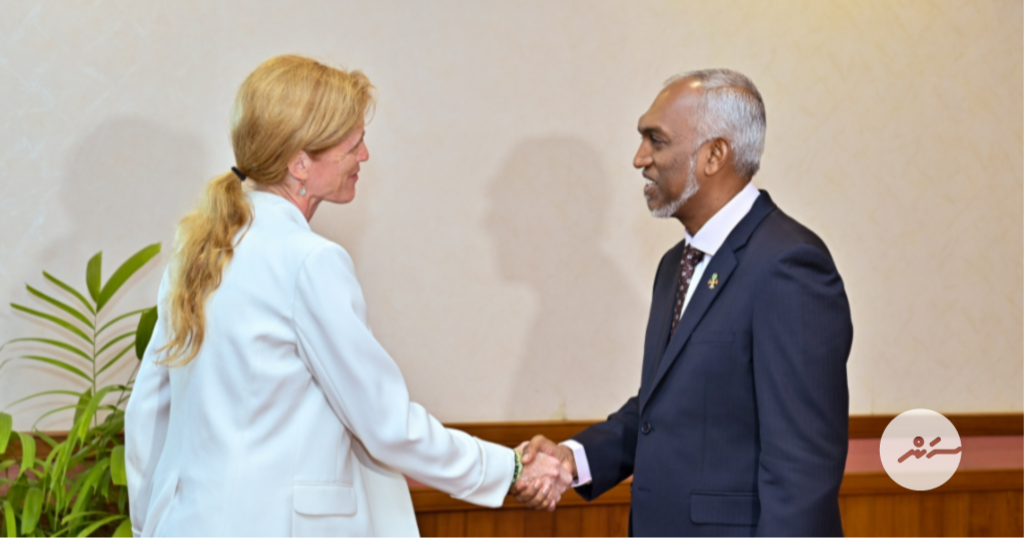 ބައިނަލްއަޤުވާމީ ބާޒާރަށް ރާއްޖޭގެ މަސްވެރިކަމުން އުފައްދާ އުފެއްދުންތަކުން ނަގާ ޓެރިފް ރޭޓު ކުޑަކުރަން ރައީސުލްޖުމްޙޫރިއްޔާ ޑރ. މުޙައްމަދު މުއިއްޒު، އެ މަނިކުފާނު ހުވާކުރެއްވުމުގެ ރަސްމިއްޔާތަށް ވަޑައިގެންނެވި އެމެރިކާގެ ވަފުދާ އެކު މަޝްވަރާ ކުރައްވައިފިއެވެ.