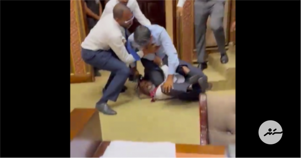 ސޯޝަލް މީޑިއާގައި ދައުރުވަމުން އަންނަ ވީޑިއޯތަކުން ފެންނަ ގޮތުގައި މަޖިލީހުގެ ރިޔާސަތަށް މެމްބަރުން އެއްވެ، އެއް މެމްބަރަކު އަނެއް މެމްބަރުގެ ގަޔަށް އަތްލައި ވަރަށް ބޮޑަށް ހަަމަނުޖެހުން އަންނަނީ ހިންގަމުންނެވެ.