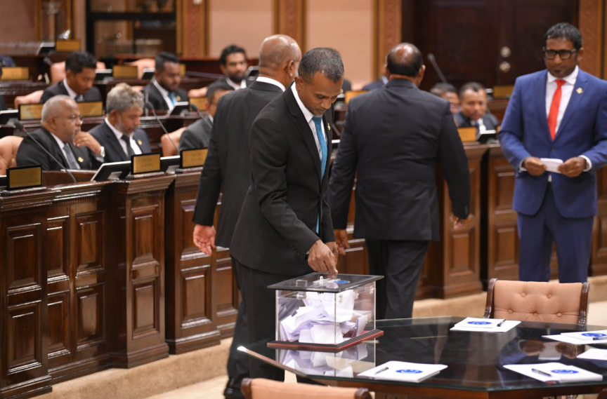 ވިހި ވަނަ ރައްޔިތުންގެ މަޖިލީހުގެ ރައީސް އަބްދުއްރަހީމް އަބްދުއްﷲ (އަދުރޭ) އެ މަގާމަށް ހޮވުމަށް ނެގި ވޯޓުގެ ތެރެއިން -- ފޮޓޯ/ މަޖިލިސް