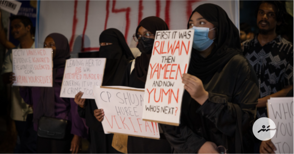 މި މަހުގެ 18ވަނަ ދުވަހު ފުރާޅެއްގެ މައްޗަށް ވެއްޓިފައި އޮއްވައި، ފެނުނު ހައްވާ ޔުމްނު ރަޝީދަށް އިންސާފު ހޯދައިދިނުމަށް ގޮވައިލައި ކުރަމުން އަންނަ އިހުތިޖާޖު، ކޮމިޝަނާ އޮފް ޕޮލިސްގެ މަގާމުގައި ހުންނެވި އަލީ ޝުޖާއު އިސްތިއުފާ ދެއްވުމުން ވެސް ހުއްޓާނުލާ ކުރިއަށްގެންގޮސްފިއެވެ.