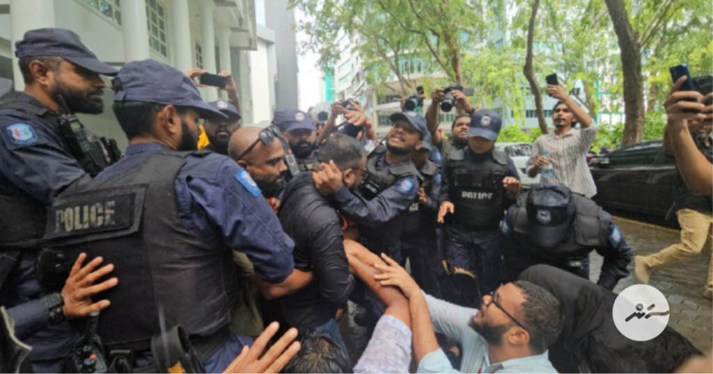 އެ މުޒާހަރާގެ ބައިވެރިން ރައީސް އޮފީސް ކައިރީގައި ތިއްބައި ފުލުހުން ވަނީ މުޒާހަރާއަށް ހުރަސްއަޅައިފައެވެ. އެގޮތުން، ދައުރުގެ ނޫސްވެރިޔާ މުޒައްޔިން ނާޒިމާއި އަދަދު ނޫހުގެ ދެ ނޫސްވެރިން ކަމަށްވާ މުހައްމަދު ޝަހުޒާނާއި އަހުމަދު އާއިދުގެ އިތުރުން ސިޓިޒެން ނޫހުގެ ނޫސްވެރިޔާ އަދި މީޑިއާ ކައުންސިލްގެ ކުރީގެ މެންބަރު މޫސާ ރަޝީދު، ހިފަހައްޓައިގެން ގެންގޮސްފައިވެއެެވެ.