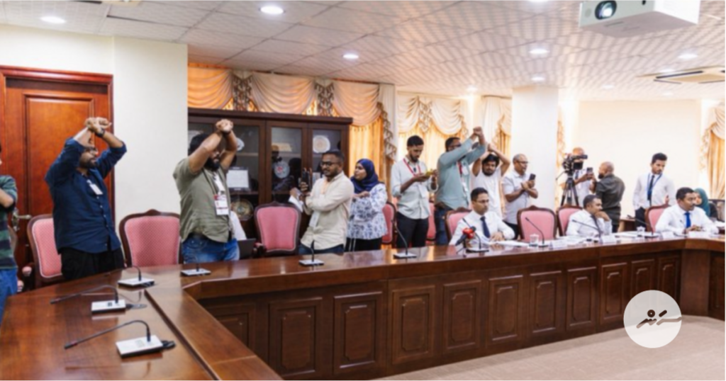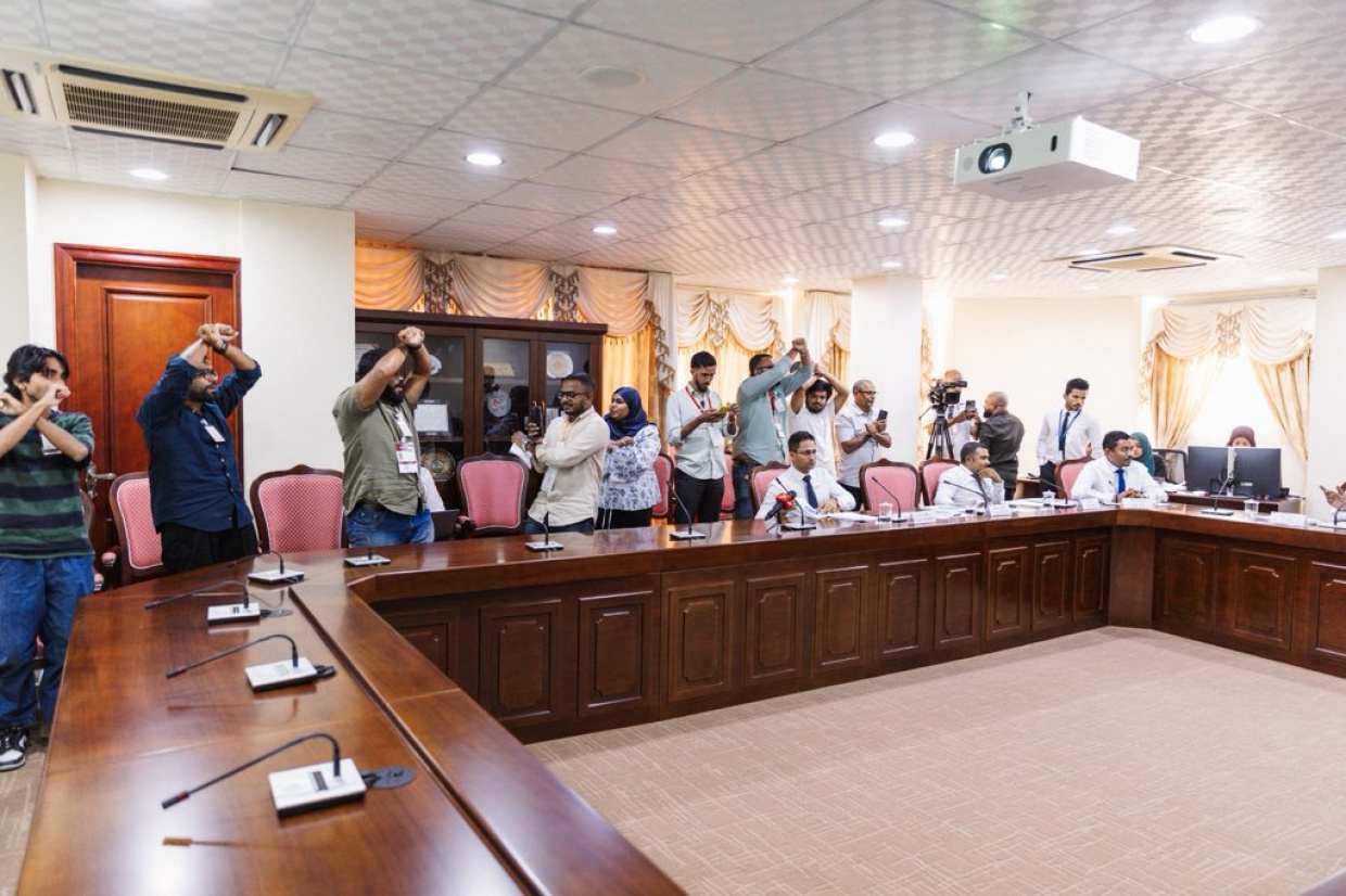 މިނިވަން މުއައްސަސާތަކުގެ ކޮމިޓީ: މީޑިއާ ބިލު ދިރާސާ ކުރުމުގެ މަރުހަލާގައި ކޮމިޓީގައި ނޫސްވެރިން އިހުތިޖާޖުކުރި -- ފޮޓޯ/ މަޖިލިސް