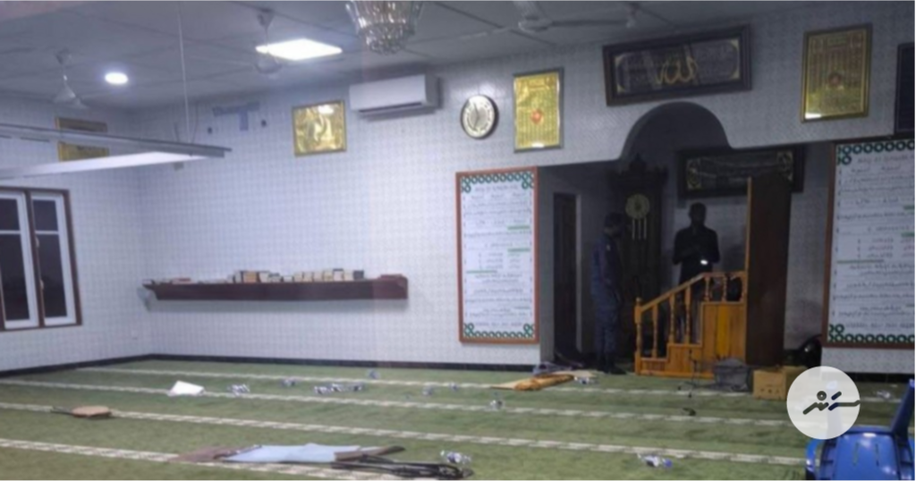 ސޯޝަލްމީޑިއާގައި ދައުރުވަމުން އަންނަ ވީޑިއޯއަކުން، އެ މިސްކިތުގެ ތެރޭގައި ގޮނޑިތައް އުކާފައި ހުރި މަންޒަރު ފެނެއެވެ. އަދި، ބައެއް ތަކެއްޗަށް ގެއްލުންދީފައިވާ ތަން ވެސް ފެނެއެވެ.