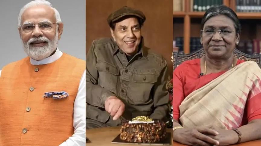އިންޑިއާގެ ރައީސް މުރްމޫ އާއި ބޮޑު ވަޒީރު ނަރެންދްރަ މޯދީ އަދި ކުރީގެ އެކްޓަރު ދަރުމެންދްރަ--ފޮޓޯ/ޓެލެގްރާފްއިންޑިއާ