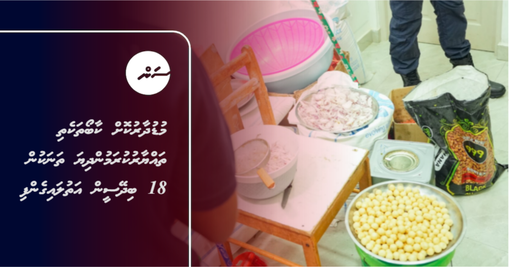 އާންމު ސާފުތާހިރުކަމަށް ބެލުމެއް ނެތި ފުޅާ ދާއިރާއެއްގައި ކާބޯތަކެތި ތައްޔާރުކޮށް، ޑެލިވާ ކުރަމުންދިޔަ ތަނަކާއި، ބިދޭސީން ދިރިއުޅެމުންދާ ހަތަރު އެކޮމޮޑޭޝަން ބްލޮކެއް ބަލައި ފާސްކުރުމަށްފަހު 18 ބިދޭސީއަކު އަތިލައިގެންފިއެވެ.