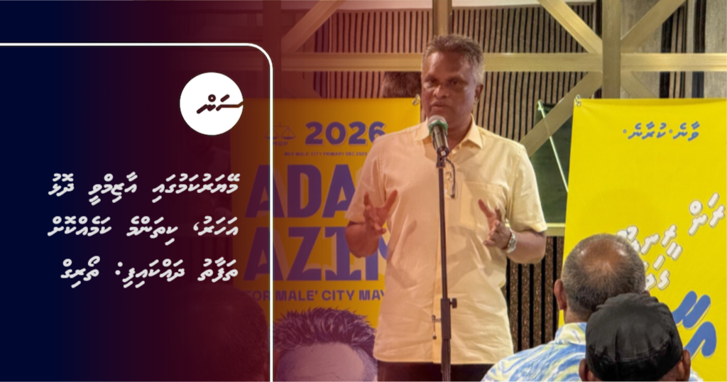 އާދަމް އާޒިމްގެ ކެމްޕެއިން ޓީމުން ރޭ ހުޅުމާލޭގައި ބޭއްވި ޖަލްސާގައި ވާހަކަ ދައްކަވަމުން, ކުރިން މަނަދޫ ދާއިރާގެ މެންބަރުކަން ވެސް ކުރެއްވި ތޯރިގް ވިދާޅުވީ, އެމްޑީޕީގެ ޓިކެޓުގައި ވެސް އެތައް ބޭފުޅަކު މާލޭގެ މޭޔަރުކަން މީގެ ކުރިން ކުރައްވާފައިވާ ކަމަށާއި ނަމަވެސް މާލޭގެ ބިންތައް ދީފައިވާ ގޮތުގެ ތަފުސީލު ހާމަކުރައްވަން ކެރިވަޑައިގަތީ އާޒިމަށް ކަމަށެވެ. އާޒިމް މަގާމުގައި މި ވީ ދޮޅު އަހަރެއްގެ ތެރޭގައި މީގެ ކުރިން ނުކޮށް އޮތް އެތައް ކަމެއް ކުރައްވައި ތަފާތު ދައްކަވާފައިވާ ކަމަށް ތޯރިގް ވިދާޅުވިއެވެ.